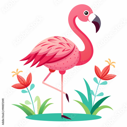 © Rizaldi, Fototapeta premium Pink Flamingo Standing on One Leg in Grass with Flowers
