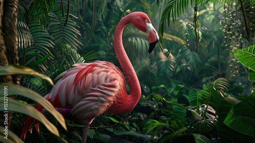 Fototapeta premium Pink Flamingo Standing Tall in Lush Jungle Environment