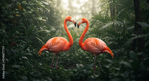 Fototapeta premium Pink Flamingos Forming Heart in Lush Nature Environment