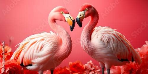 © Rassamee, Obraz premium Pink flamingos with orange heads love each other. red background