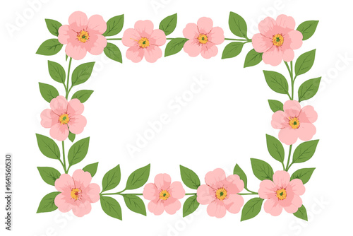 Fototapeta premium Pink floral border frame with delicate flowers and green leaves, hand-drawn...
