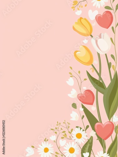 Naklejka premium Pink floral border, tulips, daisies, hearts, pastel background, card design