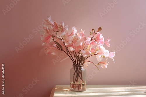 © BISO, Naklejka premium Pink floral vase on pastel wall for calm summer studio mood