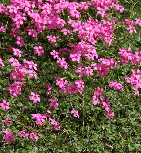 Naklejka premium Pink florets in a green grass. Summer clearing.