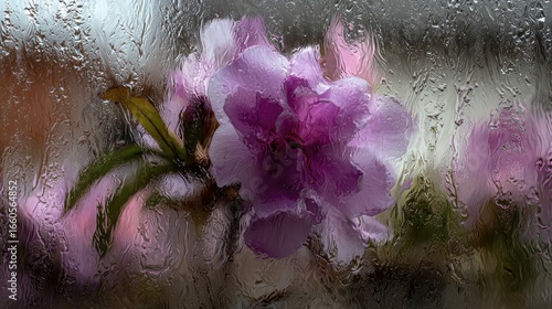 © JSR, Obraz premium Pink Flower Blossom Viewed Through Rain Covered Window Close Up Macro Photography Of Delicate Petals, Blurry Background, Springtime Tranquility