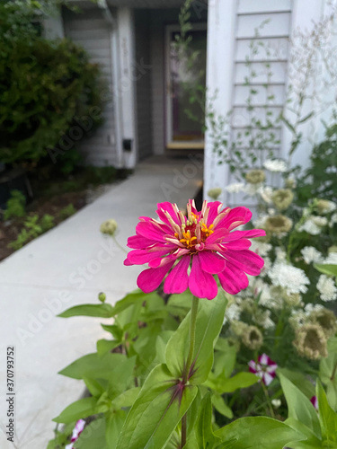 © Eman, Fototapeta premium Pink flower close up in front yard. strong independent Pinkish purple flower. grown up from seed during quarantine. Hope exists even in tough times.