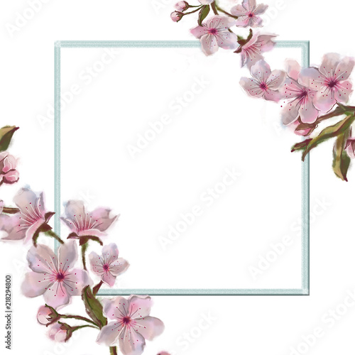 © NWolfgang, Fototapeta premium Pink Flower Decorated Corners Square Frame Isolated on White. Square Template Framed and Decorated with Pink Spring Flowers.
