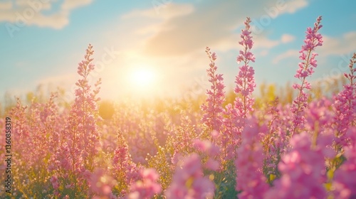 Naklejka premium Pink Flower Field at Sunset: A Serene Summer Landscape