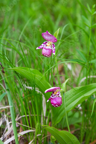 © JaneMoon, Fototapeta premium Pink flower lady's slipper spotted among green grass