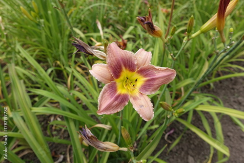 © Anna, Fototapeta premium Pink flower of Hemerocallis fulva with yellow throat and purple halo in mid July