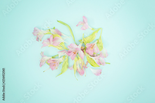 © k_zhuravleva, Fototapeta premium Pink flower on blue background, flat lay