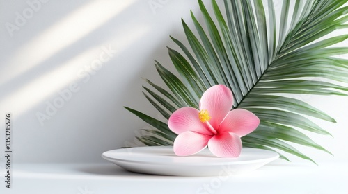 © ahmad, Fototapeta premium Pink flower on white plate with palm leaf