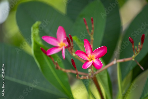 © Yan, Fototapeta premium Pink flower with fresh leaf background