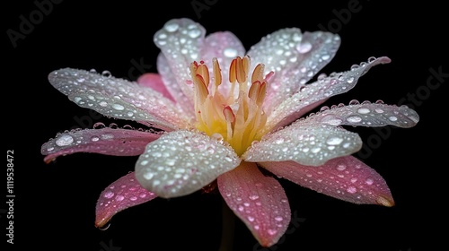 © Olsen, Fototapeta premium Pink flower with water droplets on petals against a black background.