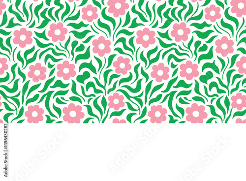 © OneVectorArt, Obraz premium Pink flowers, abstract leaves on white background. Seamless pattern for fashion design, fabric, wallpaper and all kinds of prints.