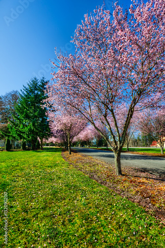 © Jo Ann Snover, Naklejka premium Pink flowers against a deep blue sky on a Spring morning