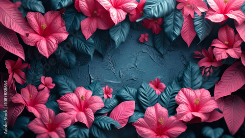 © PixelFusion Creation, Obraz premium Pink Flowers and Blue Leaves with Textured Center