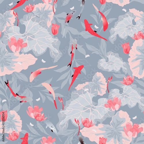 © Galina Trenina, Fototapeta premium Pink flowers and green leaves of lotuses, koi carps in light blue water. Seamless hand-drawn vector illustration with a pond. Square repeating design for fabric and wallpaper