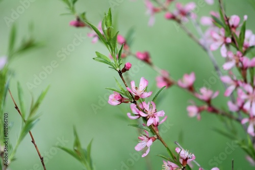 © Girts, Obraz premium pink flowers and green leaves on branches close-up with blurred background