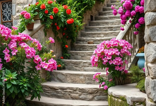 Naklejka premium Pink flowers bloom beside charming, winding stone stairs, beauty, pathway