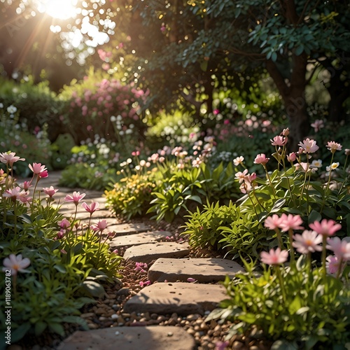© S.Vidyavathi, Obraz premium pink flowers in a garden pathway