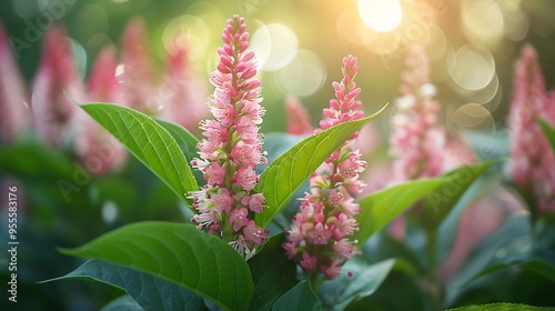 Obraz premium Pink flowers in bloom, with green leaves and a soft blurred background.