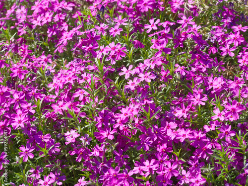 Naklejka premium Pink flowers meadow. Pink phlox subulate field. Flowers landscape. Pink moos...