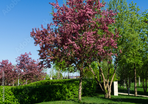 Naklejka premium Pink flowers of Apple Malus pumila 'Niedzwetzkyana'. Dark pink blossoms of Niedzwetzky's apple in public landscape city park Krasnodar or Galitsky park. Spring floral pattern design. Selective focus