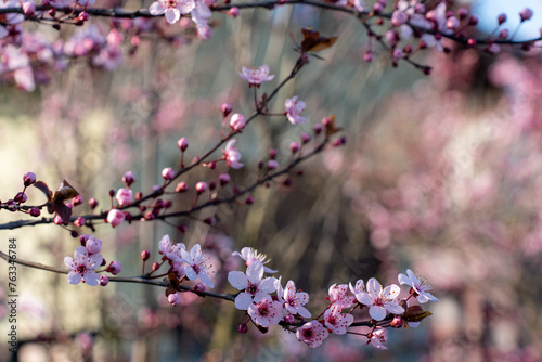 © Maryia, Obraz premium Pink flowers on a peach tree in the spring in the garden