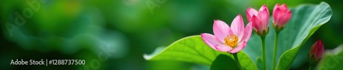 © methinee, Fototapeta premium Pink flowers peeking from behind a green leaf, hidden blossom, botanical, plant life