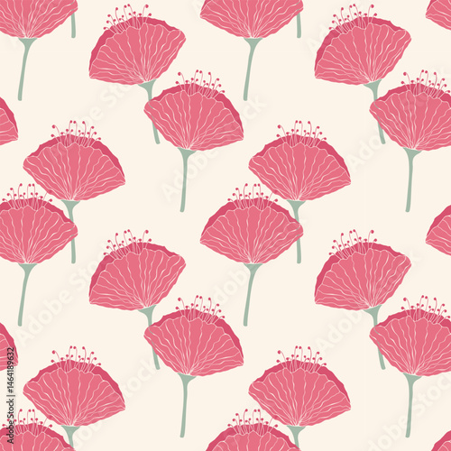 © MarhaRyta, Obraz premium Pink flowers poppy pattern, hand drawn flowers on light creme background. Delicate feminine tones.