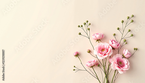 © Iuliia, Naklejka premium Pink flowers with delicate branches on beige background