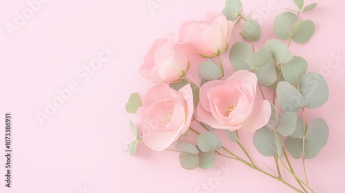 Fototapeta premium Pink flowers with green leaves on a pink background