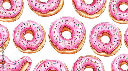 © Galaxyd, Fototapeta premium Pink frosted donuts with sprinkles seamless pattern.