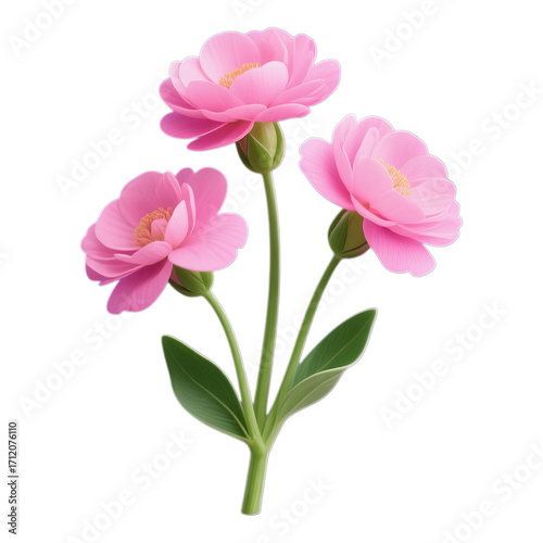 © dreamscapeimages, Fototapeta premium Pink Gerbera Daisies with Green Stem and Leaves, Blooming on Transparent Background, 3D Realism Graphic Element