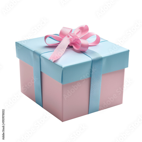 © Essa, Obraz premium Pink gift box with blue ribbon and bow, studio close-up isolated on Transparent Background