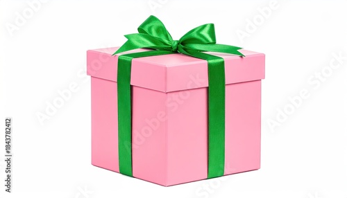 Obraz premium Pink gift box with green ribbon and bow isolated on white background.