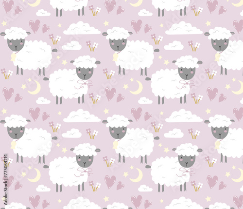 © Sofiia, Fototapeta premium Pink Girly Seamless Pattern for Children with Sheep, Clouds, Hearts in Cute Style