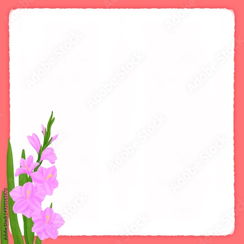 Naklejka premium Pink gladiolus on white sticky notes on red background