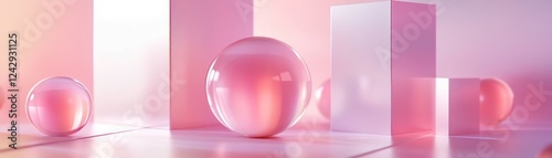 © Penatic Studio, Obraz premium Pink Glass Spheres Resting on Pink Geometric Platforms