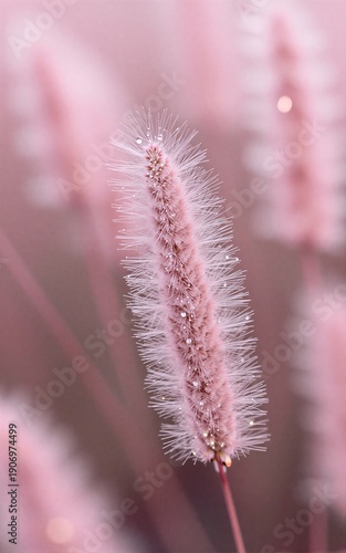 © YiuCheung, Obraz premium Pink grass spike adorned with dewdrops, soft focus background.