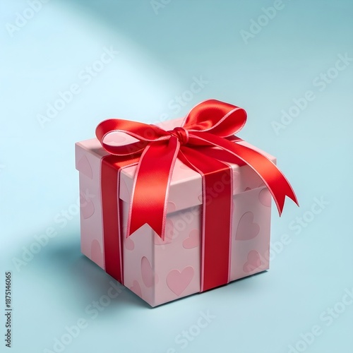 Fototapeta premium Pink Heart Pattern Gift Box with Luxury Red Satin Ribbon on Pastel Blue...