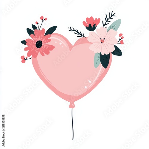 Obraz premium Pink Heart Shaped Balloon with Delicate Floral Arrangement Romantic Illustration