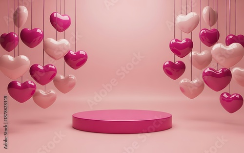 © MdYasin, Fototapeta premium Pink hearts floating above a round platform