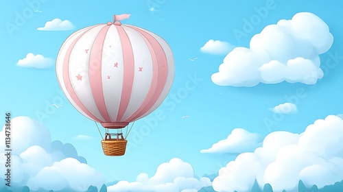 © amanah, Fototapeta premium Pink hot air balloon floating in a blue sky with fluffy clouds.