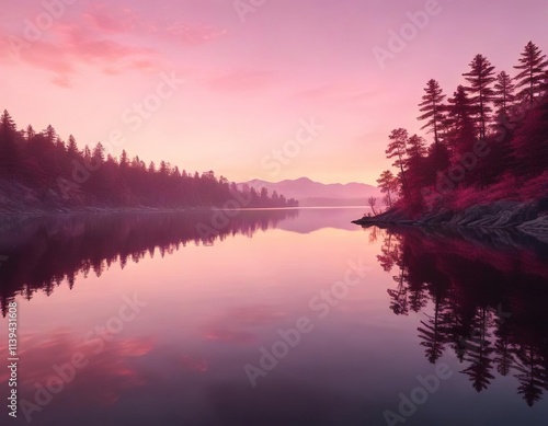 © AiGallery, Fototapeta premium Pink hues of a sunset reflected on a calm lake against a blush pink background, lake scene, warm tones, serene landscape
