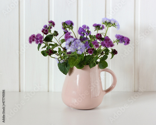 Fototapeta premium pink jug with a purple bouquet of ageratum.