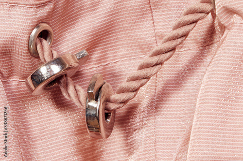 © Michail, Naklejka premium Pink lace. Pink Synthetic fabric texture, background. Black fabric,textile accessories