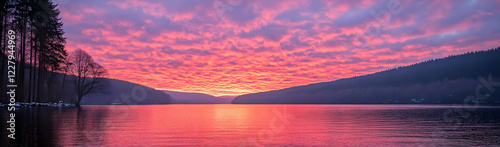 © SemangArt, Fototapeta premium Pink lake sunset, winter trees, hills