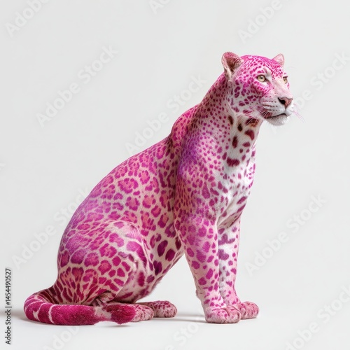 © alphaspirit, Naklejka premium Pink leopard sitting and looking up on white background